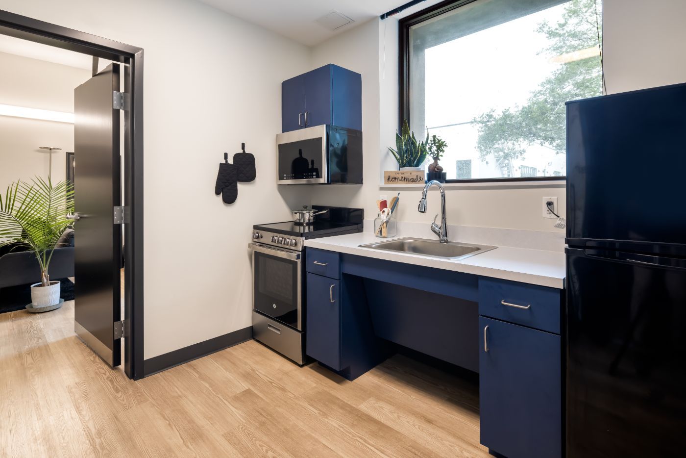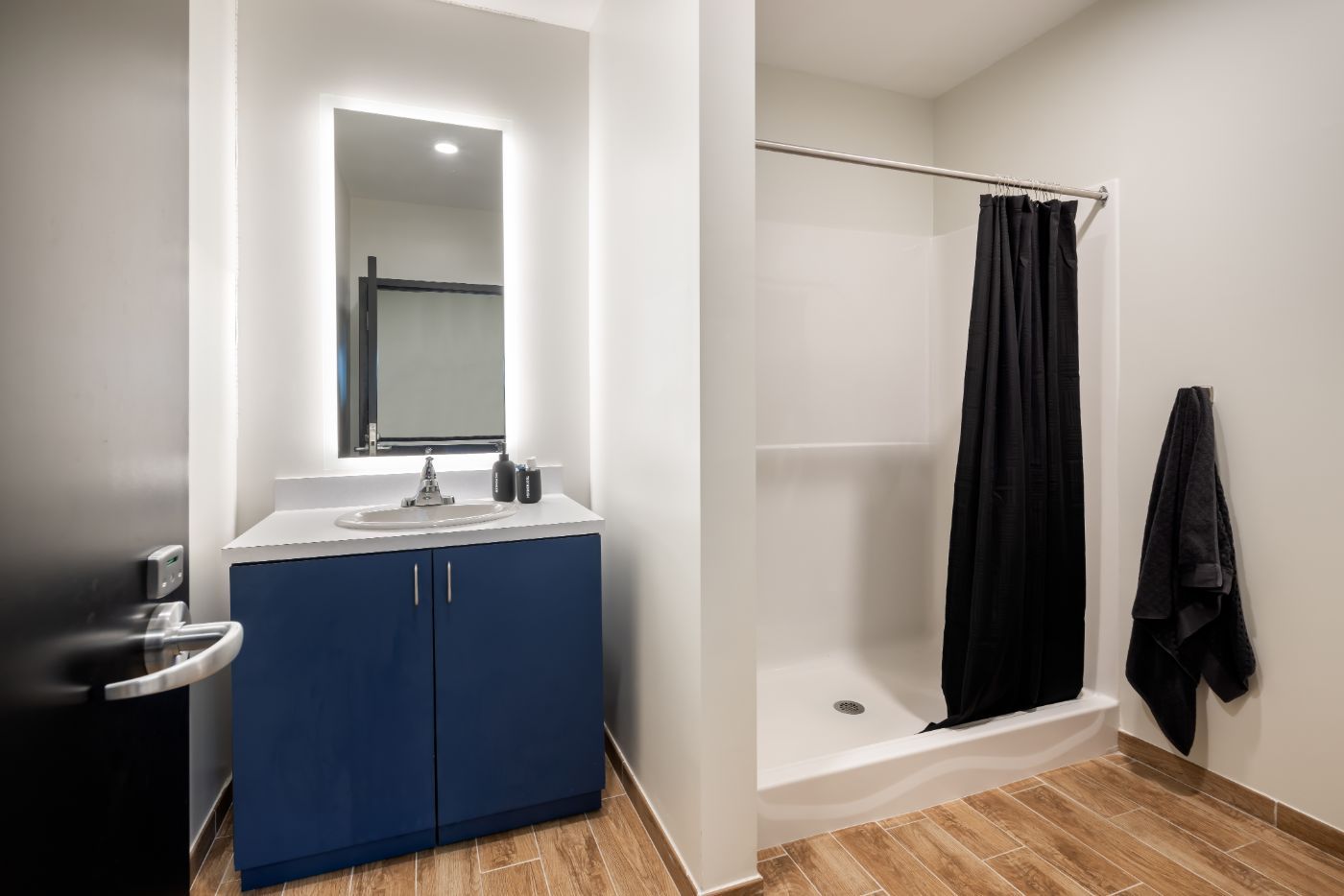 The residence hall includes 154 hybrid-style units tailored for modern student needs. Each unit connects two double-occupancy bedrooms with a shared kitchenette and private bathroom—offering a balance of privacy and community. Every floor also includes multiple lounge areas, quiet study rooms, and in-building laundry facilities, creating a comfortable and connected living environment for students.